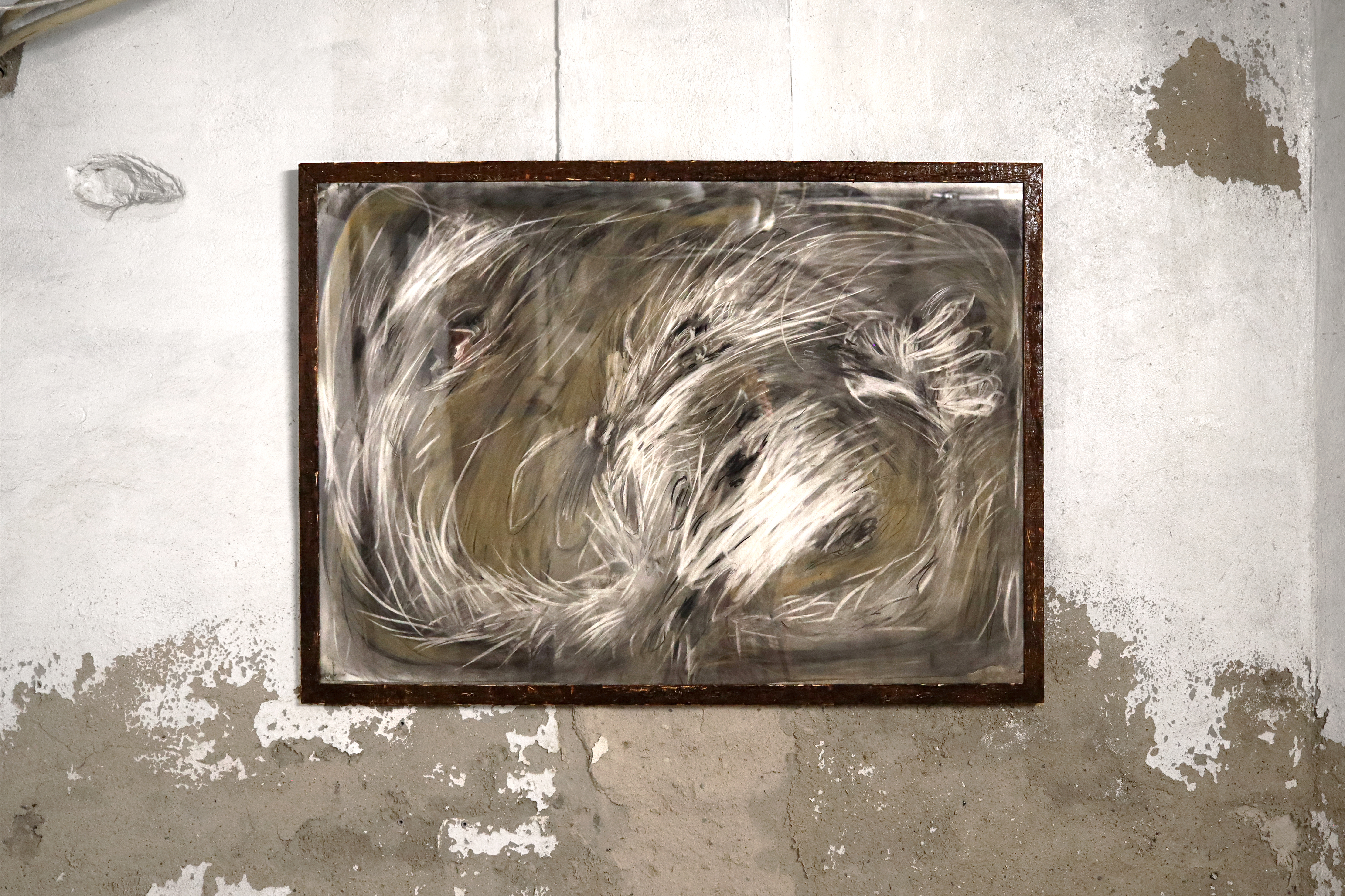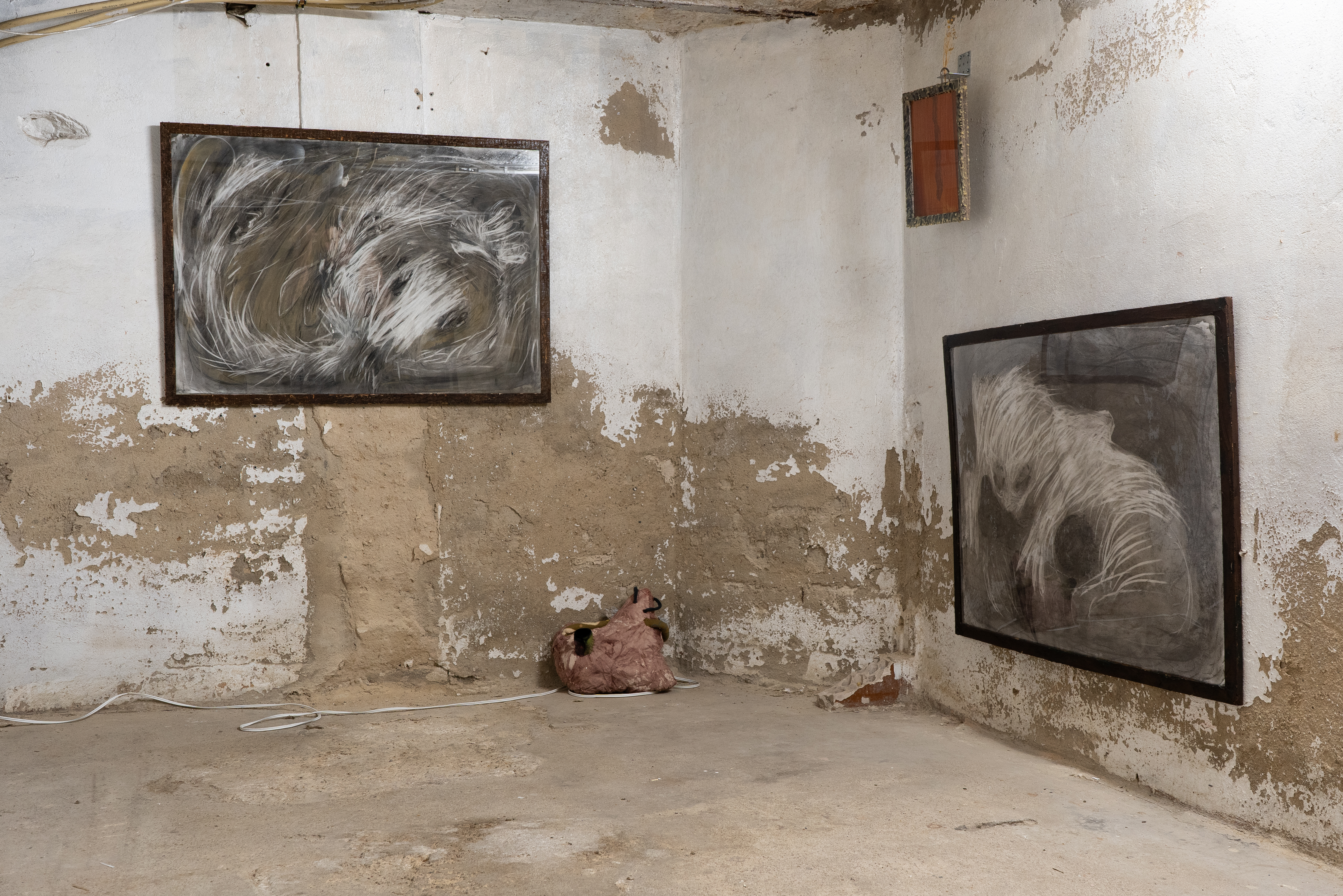 Bog Bodies was a collaborative installation of paintings, sculpture, and immersive sound by Scott Carver and Ebb Bayley. In the subterranean gallery space of Horse & Pony, it imagined a portal and a space out-of-time, giving voice to a choir of bog bodies that mumbled, spoke, and sung to each other in real-time across 20 speaker sculptures distributed the gallery.